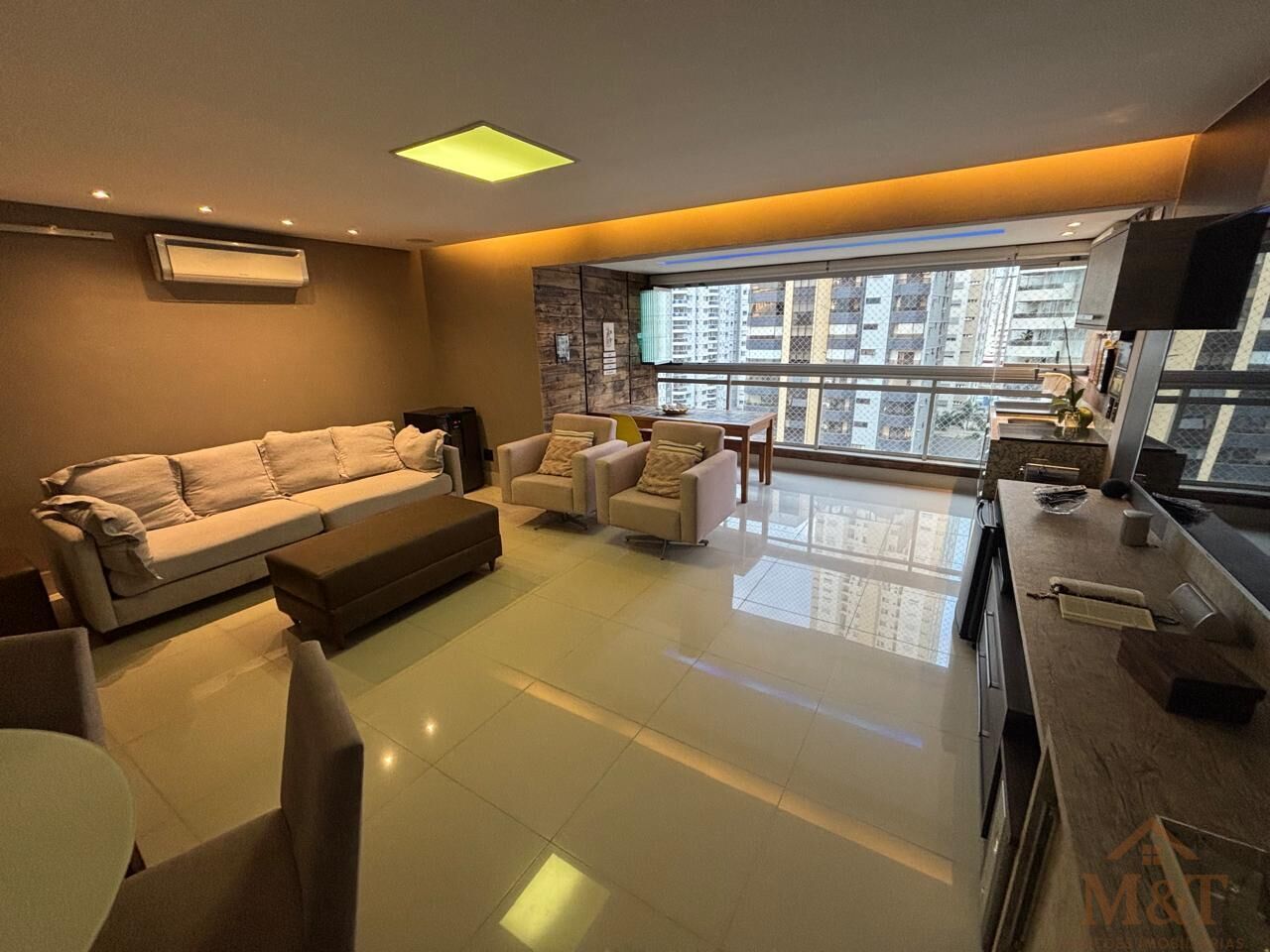 Ampla sala com lavabo, varanda gourmet integrada, cortinada de vidro, tela solar e ar condicionado split