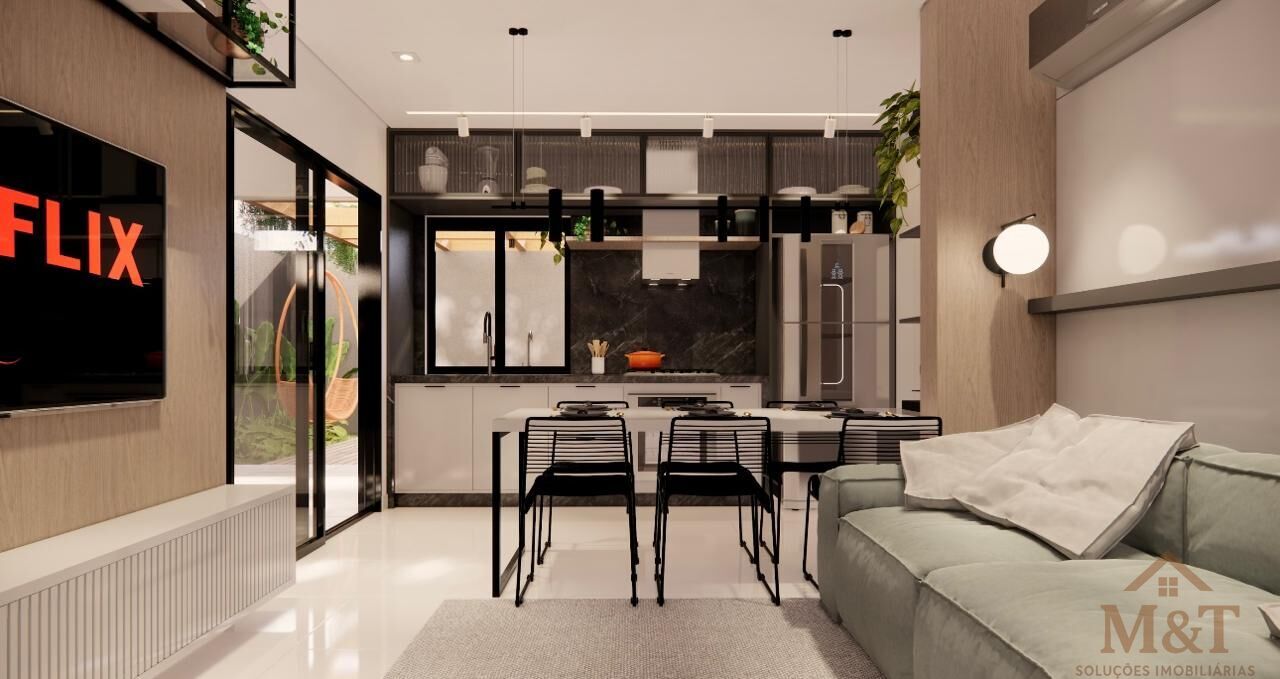 Piso inferior: Sala integrada com a cozinha, lavabo, área de serviço e 2 vagas de garagem.